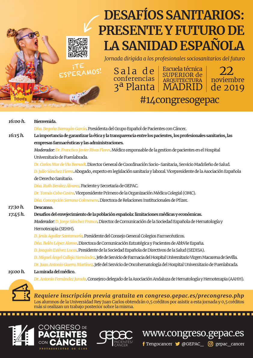 El día previo al estreno del 14º Congreso de Pacientes con Cáncer y, como en todas las buenas películas, tendrá lugar el esperado preestreno. El viernes 22 de noviembre por la tarde, celebraremos las jornadas de precongreso. Estas sesiones formativas están dirigidas a profesionales del sector sanitario y de la comunicación y abordan temáticas concretas y de interés para cada uno de los agentes que intervienen de manera directa o indirecta en el proceso oncológico.