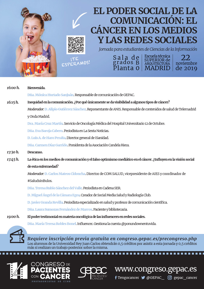 Dirigida a los futuros periodistas y comunicadores. A través de dos mesas redondas y una ponencia individual, se debatirá sobre la falta de equidad comunicativa a la hora de hablar sobre los diferentes tipos de cáncer y el poder de los medios de comunicación para influir en la visión que la sociedad tiene sobre esta enfermedad. Finalmente, se cerrará la jornada con una charla sobre el potencial con el que cuentan las redes sociales y los testimonios sobre oncología que allí se encuentran.